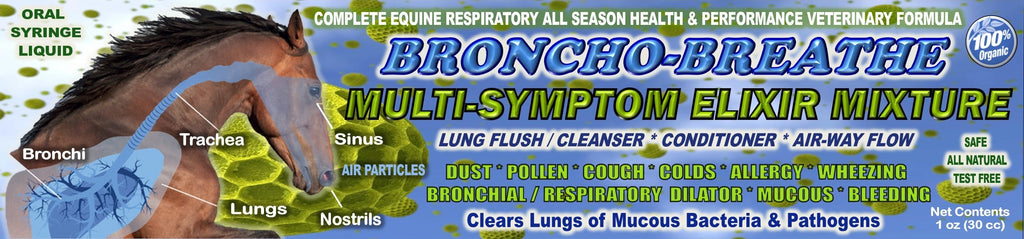 Broncho Breathe is a multi-symptom elixir mixture that clears lungs of mucous, bacteria & pathogens. It's the complete equine respiratory all season health and performance veterinary formula.